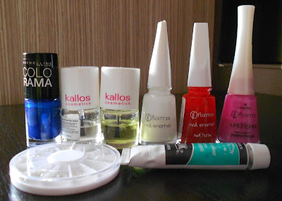 - pe degetul mic am pus benzi adezive si am aplicat cate doua straturi de albastru Colorama si Flormar rosu nr 404.